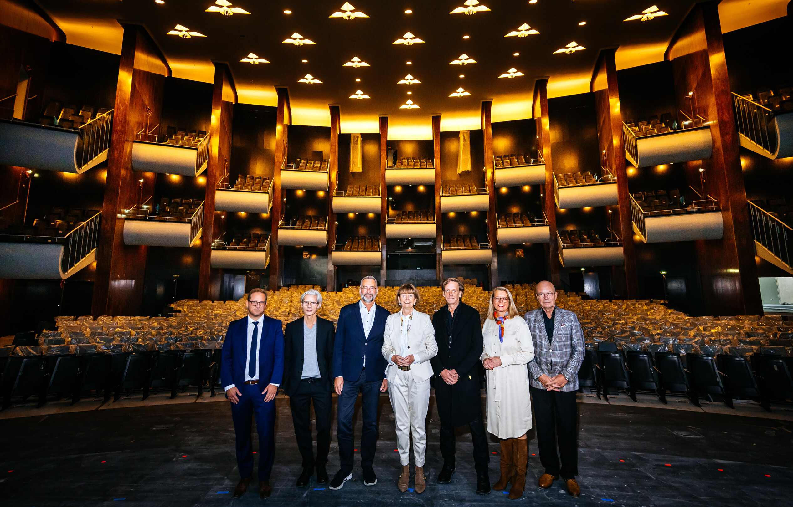 Oberbürgermeisterin Henriette Reker (Mitte) mit (v.l.) Projektleiter Jürgen M. Volm, Kulturdezernent Stefan Charles, Intendant Hein Mulders, Intendant Kay Voges, Stadtdirektorin Andrea Blome und Bernd Fülle, Geschäftsführender Direktor Bühnen Köln